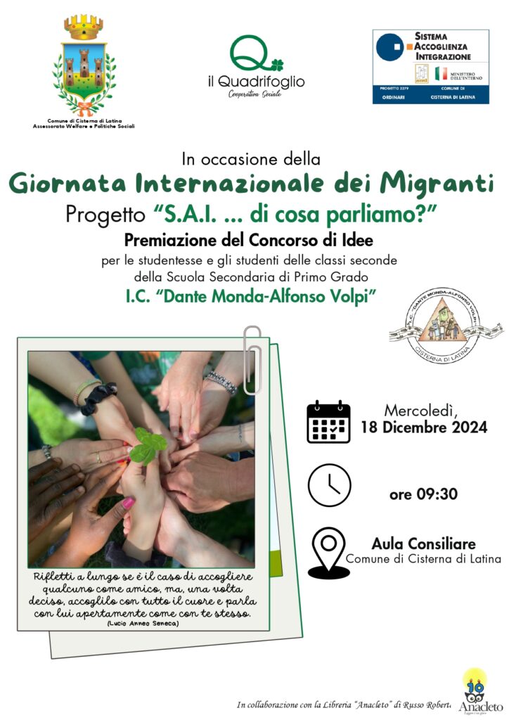 Progetto SAI del Comune di Cisterna di Latina ha promosso, per le studentesse e gli studenti delle classi seconde dell’I.C. Dante Monda -Alfonso Volpi, un Concorso di idee che ha avuto come obiettivo principale quello di rendere gli studenti protagonisti, permettendo loro di comprendere a fondo il lavoro svolto dai progetti di accoglienza e diventando loro stessi “strumento” di condivisione e conoscenza.