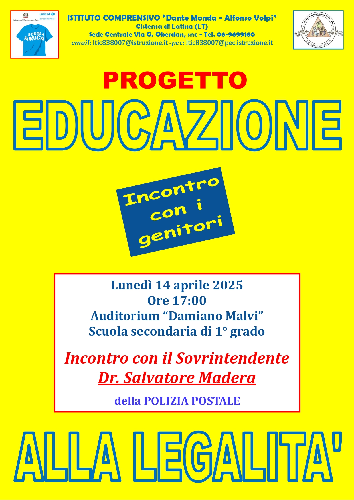 Lunedì 14 aprile 2025 - Ore 17:00 - Auditorium “Damiano Malvi” Incontro con il Sovraintendente della Polizia Postale Dott. Salvatore Madera